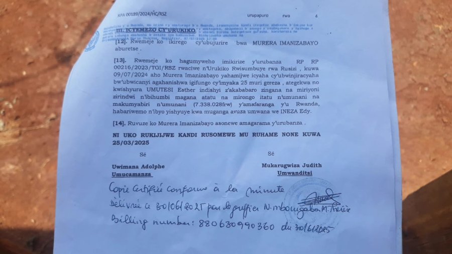 Sindayiheba Phanuel, ni Umuyobozi w’akarere ka Rusizi ati “Uyu mubyeyi mu bushobozi buboneka yagiye afashwa kuvuza umwana kandi bizakomeza. Ibijyanye no kurangiza urubanza, iyo rwamaze kugirwa itegeko yitababaza abahesha b’inkiko b’umwuga bakamufasha kurangiza urubanza, cyangwa abatari ab’umwuga na bo bakamufasha.”