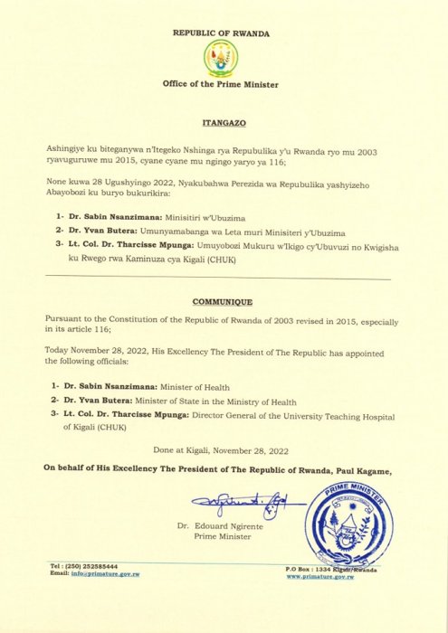 Itangazo ryavuye mu biro bya Minisitiri w’Intebe,kuri uyu wa mbere tariki ya 28 Ugushyingo 2022,rivuga ko Dr Sabin Nsanzimana yagizwe Minisitiri w’Ubuzima.