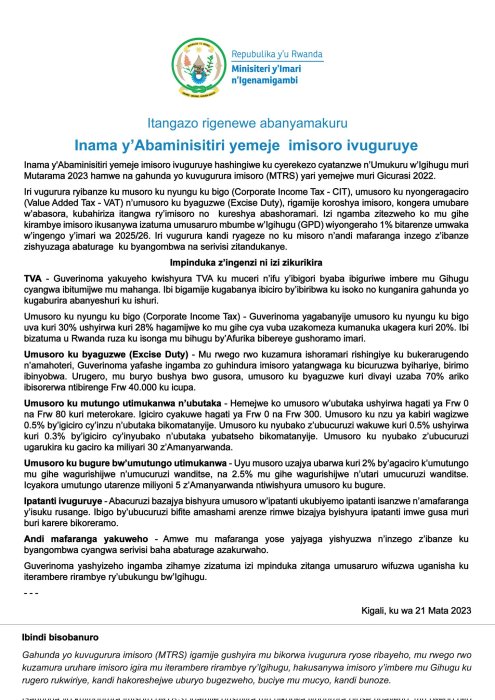 Mu itangazo ryashyizwe hanze na Minisiteri y’imari n’igenamigambi,kuri uyu wa 21 Mata 2023,rivuga ko Guverinoma yakuyeho umusoro wa TVA ku muceri n’ifu y’ibigori byaba ibiguriwe mu Rwanda no hanze mu rwego rwo kugabanya ibiciro by’ibiribwa ku isoko ndetse no kunganira gahunda yo kugaburira abana ku ishuri.
