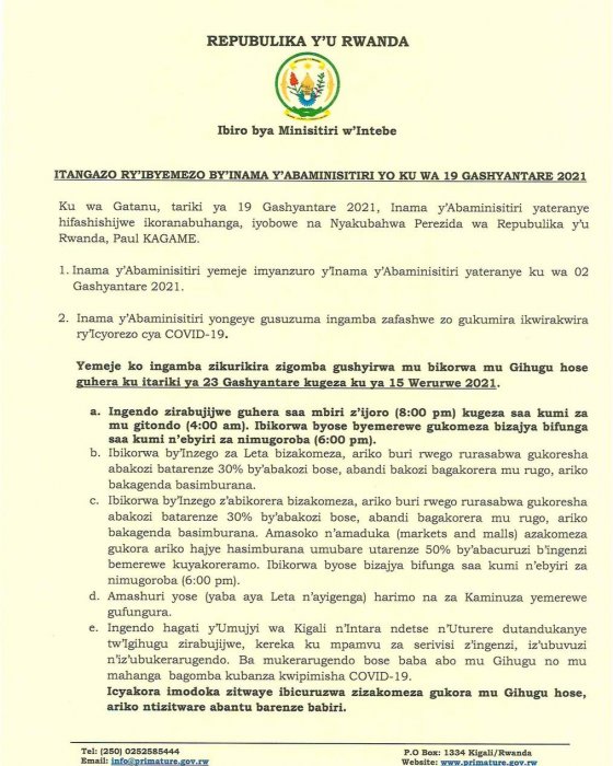 Ingendo zirabujijwe guhera saa Mbiri z’ijoro kugeza saa Kumi za mu gitondo.Ibikorwa byemerewe gukomeza gukora bizajya bifunga saa kumi n’ebyiri mu gihe (…)
