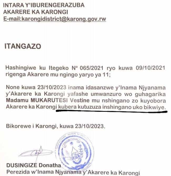 Uyu muyobozi w’aka karere ngo yegujwe ku bwo kutuzuza inshingano ze cyane cyane mu bijyanye n’imibereho y’abaturage no gukemura ibibazo by’abaturage.