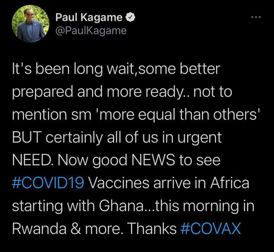 Mu butumwa yanyujije kuri Twitter ye,Perezida Kagame yashimiye Covax ati "Ni inkuru nziza kuba inkingo za Covid-19 zageze muri Afurika guhera muri Ghana...no muri iki gitondo mu Rwanda n’ahandi.Mwakoze cyane COVAX.