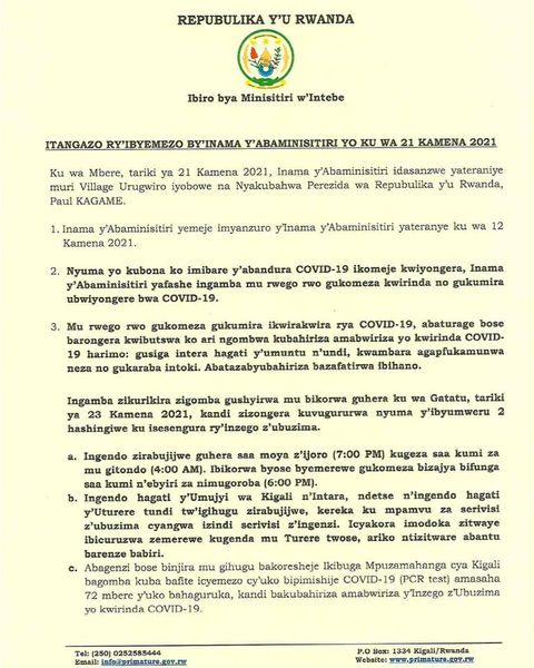 Kuri uyu wa 21 Kamena 2021,Perezida wa Repubulika Paul Kagame yayoboye Inama y’Abaminisitiri idasanzwe yafatiwemo ingamba zikarishye zo gukomeza gukumira ikwirakwira ry’icyorezo cya Covid-19 aho nta muntu wemerewe kuva mu karere ajya mu kandi cyangwa se ngo ave mu mujyi wa Kigali ajye mu ntara.