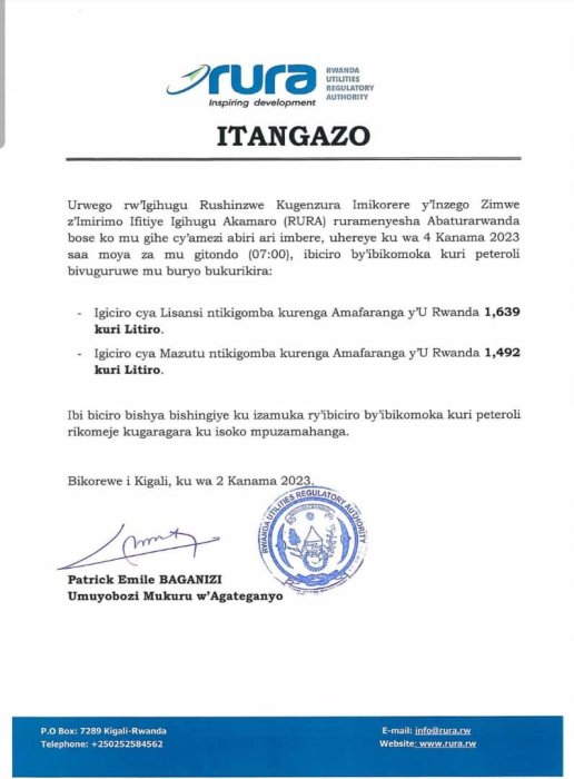 Ikigo ngenzuramikorere RURA cyatangaje ibiciro bishya by’ibikomoka kuri peteroli, aho litiro ya lisansi ari 1,639 Frw na ho iya mazutu ikaba 1492 Frw.