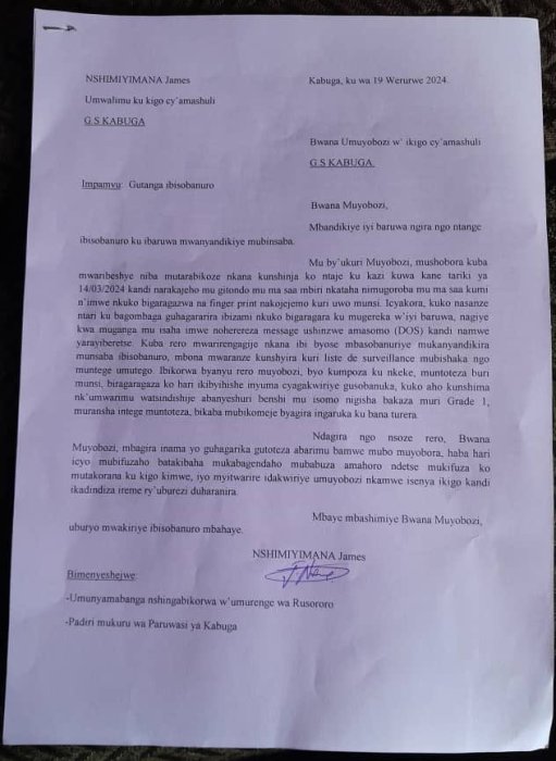 Umwarimu witwa Nshimiyimana James wo mu Ishuri rya GS Kabuga Catholic riherereye mu murenge wa Rusororo mu karere ka Gasabo,yandikiye umuyobozi w’ikigo amugira inama, amusaba guhagarika imyitwarire mibi idakwiye kuranga abayobozi.