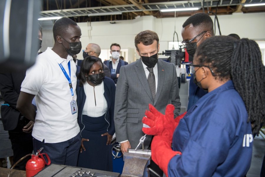 Kuri iki kigo giherereye ku birometero 30 uvuye mu Mujyi wa Kigali, Perezida Macron yasobanuriwe ibijyanye n’ubufatanye buri hagati y’iri shuri n’Ikigo cy’Abafaransa gishinzwe Iterambere (Agence française de développement,AFD).