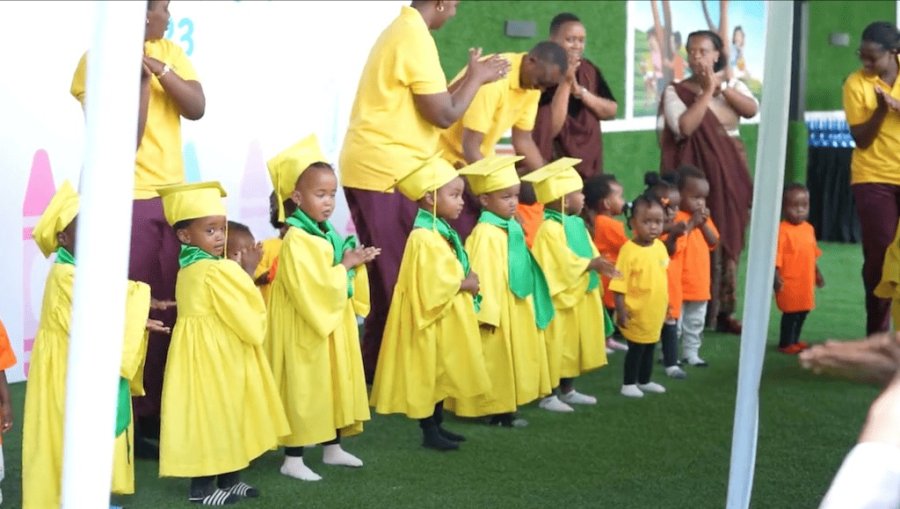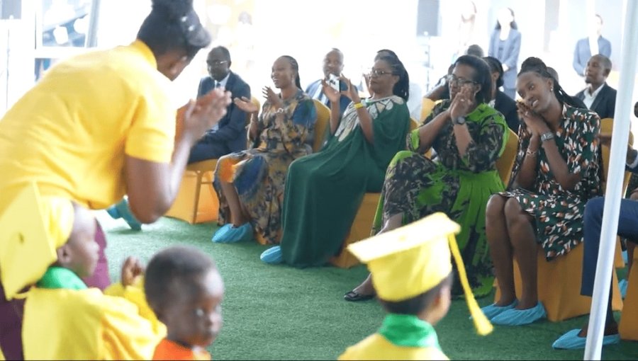 Amashusho yashyizwe hanze n’Umuryango Imbuto Foundation, watangije irerero Eza-Urugwiro ECD rikorera mu Biro by’Umukuru w’Igihugu, agaragaza abana basoje icyiciro kimwe, bari gukorerwa ibirori byo kuzamuka mu kindi.