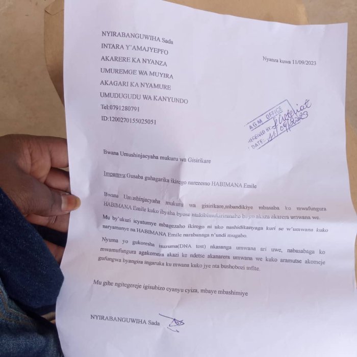 Muri iyo baruwa, Nyirabanguwiha Sada avuga ko yareze Emily kubera ko baryamanye abana n’undi mugabo, gusa ngo nyuma yo gupimisha DNA yasanze umwana ari uwa Habimana Emily, none aramusabira gufungurwa ngo akore inshingano zo kurera uwo mwana nk’umubyeyi.