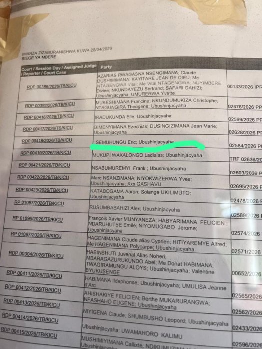 Mu gitondo cyo ku wa 28 Mata 2026 Eric Semuhungu yitabye Urukiko rw’Ibanze rwa Kicukiro aho agiye kuburana ku byaha birimo,icyaha cyo gukoresha undi imibonano mpuzabitsina ku gahato, icyaha cyo gushyira hanze amashusho yerekeranye n’imikoreshereze y’ibitsina hakoreshejwe mudasobwa cyangwa se urusobe rwa mudasobwa, n’icyaha cyo gukangisha gusebanya.