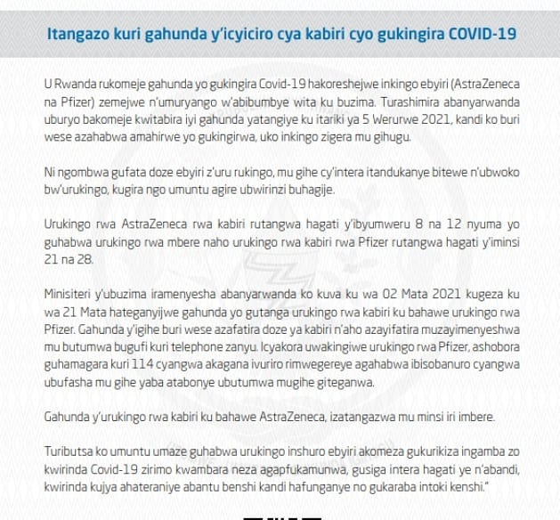 Itangazo ryashyizwe ahagaragara na Minisante rigira riti “Ni ngombwa gufata doze ebyiri z’uru rukingo mu gihe cy’intera idatandukanye bitewe n’ubwoko bw’urukingo kugira ngo umuntu agire ubwirinzi buhagije.”