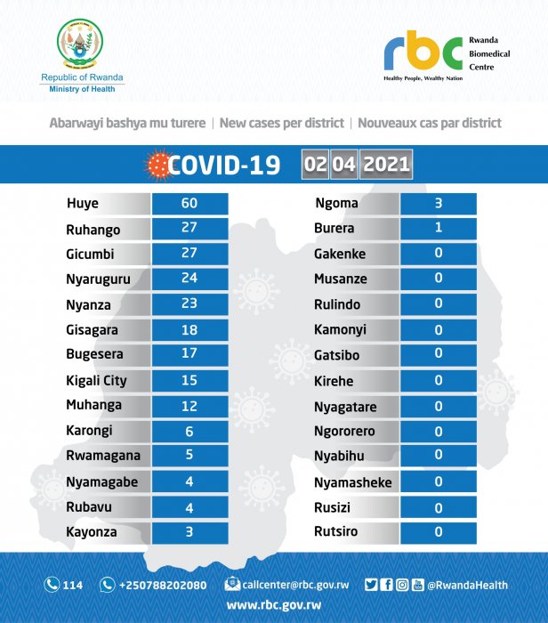 Minisiteri y’Ubuzima yatangaje ko kuri uyu wa Gatanu,tariki ya 02 Mata 2021, abagabo 2 bishwe na COVID-19 bituma abamaze gupfa mu Rwanda baba 310. Abarwayi bashya babonetse ni 249 mu gihe abakize ari 90.