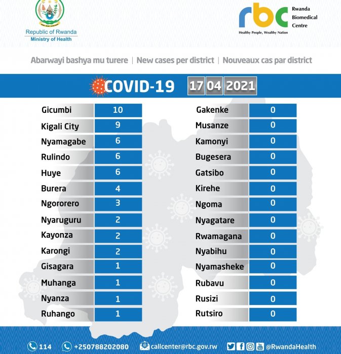 Minisiteri y’Ubuzima yatangaje ko uyu munsi tariki ya 17 Mata 2021,abantu 54 banduye Coronavirus mu Rwanda bituma umubare w’abamaze kwandura iki cyorezo mu Rwanda ugera ku 23,866.Hakize abantu 67. Abantu bakirwaye ni 1,462 barimo 6 barembye.