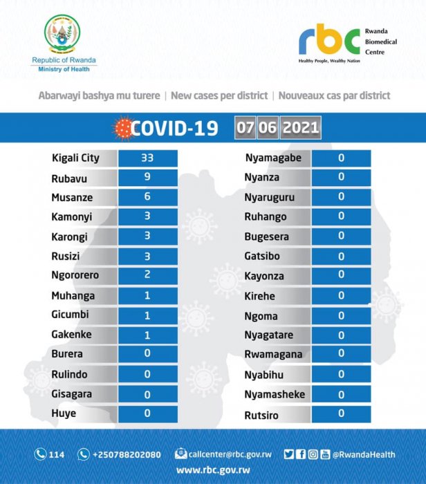 Kuri uyu wa Mbere,Minisiteri y’Ubuzima yatangaje ko habonetse abarwayi bashya 62 ba COVID-19 hakira abandi bantu 29 mu Rwanda.Abakirwaye ni 693 barimo 10 barembye.Nta muntu n’umwe wahitanwe n’iki cyorezo uyu munsi.