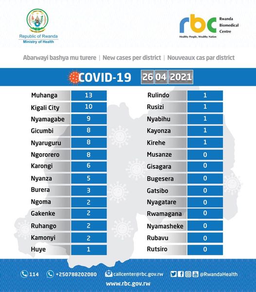 Abarwayi bashya babonetse kuri uyu wa Mbere, tariki ya 26 Mata 2021, biganjemo abo mu Karere ka Muhanga kakuwemo 13 mu gihe Umujyi wa Kigali wasanzwemo 10, Nyamagabe ni icyenda mu gihe Uturere twa Gicumbi, Ngororero na Nyaruguru, buri hose hasanzwe abarwayi umunani.
