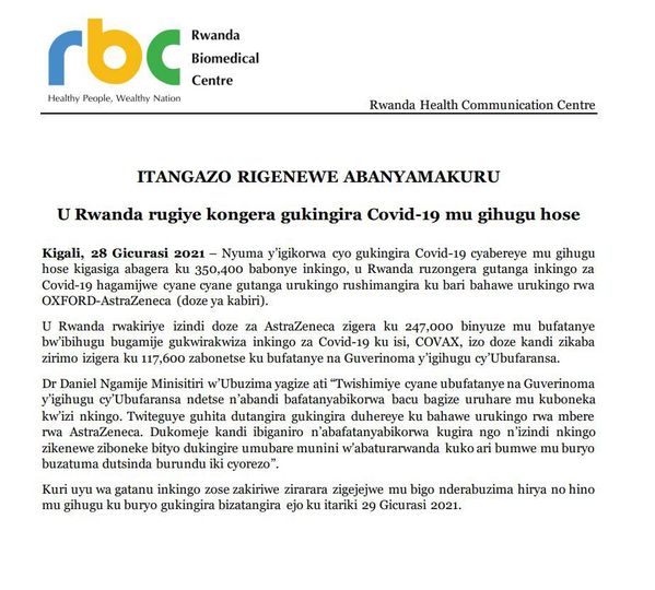 Gukingirwa byatangiye nyuma y’iminsi ibiri gusa u Rwanda rwakiriye icyiciro cya mbere cy’inkingo rwemerewe muri gahunda ya COVAX mu ntangiriro za Werurwe 2021.Abakingiwe bose mu Rwanda ni ibihumbi 350.