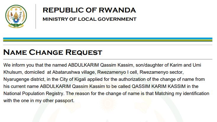 Itangazo: Abdulkarim Qassim Kassim yasabye guhindura amazina akitwa Qassim Karim Kassim