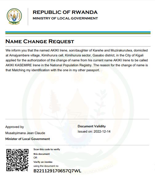 Uwitwa AKIKI Irene yasabye guhindura amazina mu buryo bwemewe n’amategeko akitwa AKIKI KASEMIRE Irene mu bitabo by’irangamimerere.