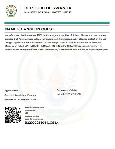 Uwitwa FATUMA Manni yasabye guhindura amazina mu buryo bwemewe n’amategeko akitwa NIYOMUGABO Fatma Johnson mu bitabo by’irangamimerere.