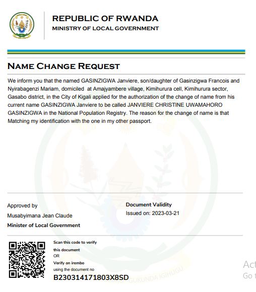 Uwitwa GASINZIGWA Janviere yasabye guhindura amazina mu buryo bwemewe n’amategeko akitwa JANVIERE CHRISTINE UWAMAHORO mu bitabo by’irangamimerere.