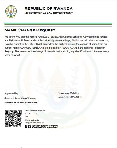 Uwitwa KANYABUTEMBO Alain yasabye guhindura amazina mu buryo bwemewe n’amategeko akitwa NTWARI Alain mu bitabo by’irangamimerere.