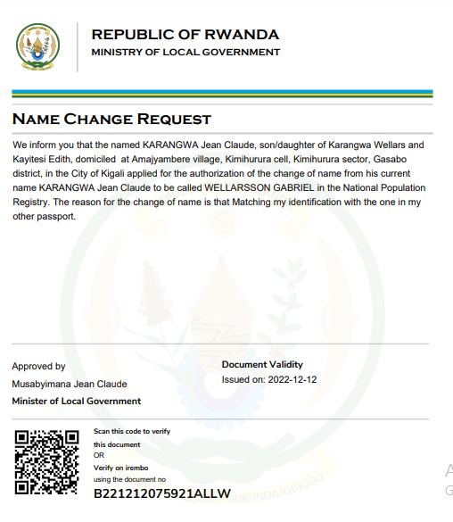 Uwitwa KARANGWA Jean Claude yasabye guhindura amazina mu buryo bwemewe n’amategeko akitwa WELLARSSON GABRIEL mu bitabo by’irangamimerere.