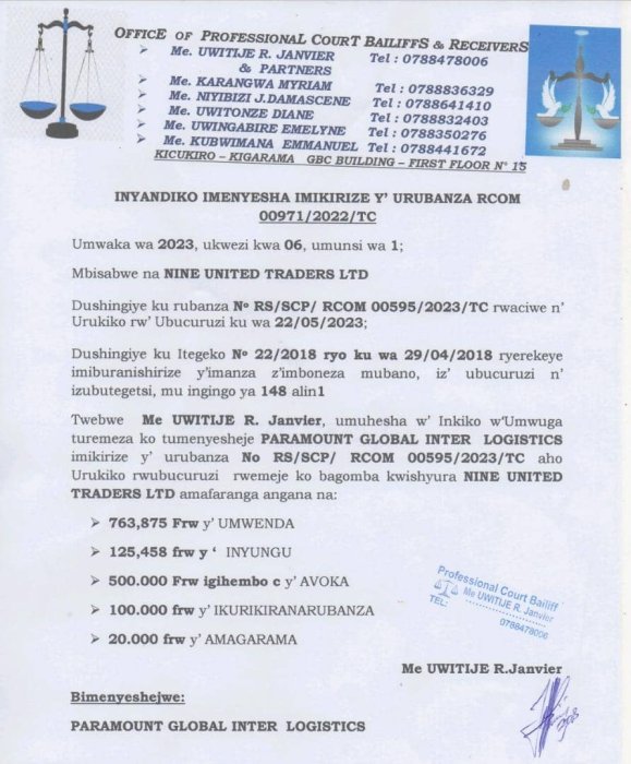 Me KUBWIMANA Emmanuel Umuhesha w’inkiko w’umwuga, ashingiye ku itegeko no 22/2018 ryo ku wa 29/04/2018 ryerekeye imiburanishirize y’imanza z’imbonezamubano ,n’izubucuruzi ,iz’umurimo n’izubutegetsi cyane cyane mu ngingo ya 218.