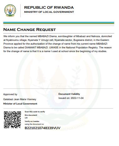 Uwitwa MBABAZI Diama yasabye guhindura amazina mu buryo bwemewe n’amategeko akitwa DIAMANT MBABAZI UWASE mu bitabo by’irangamimerere.