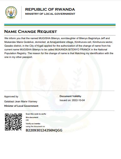 Uwitwa MUGISHA Bitenyo yasabye guhindura amazina mu buryo bwemewe n’amategeko akitwa MUKANDA BITENYO FRANCK mu bitabo by’irangamimerere.