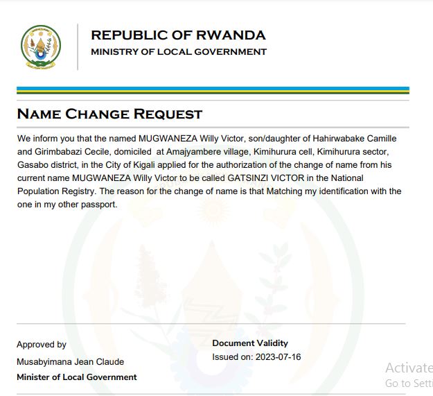 Uwitwa MUGWANEZA Willy Victor yasabye guhindura amazina mu buryo bwemewe n’amategeko GATSINZI VICTOR mu bitabo by’irangamimerere.