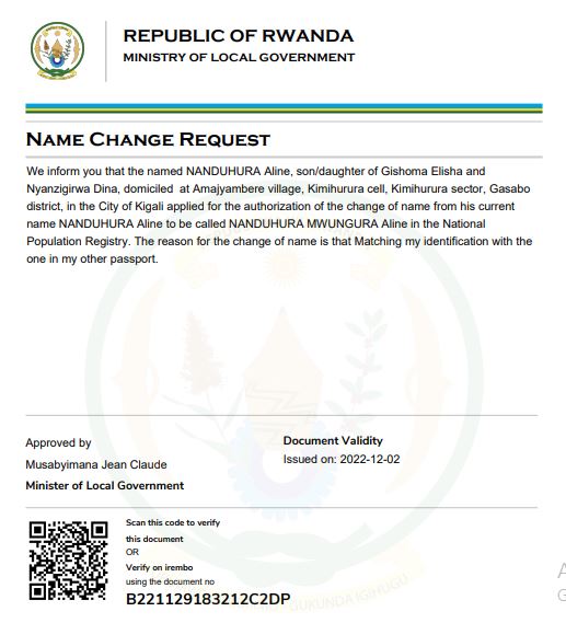 Uwitwa NANDUHURA Aline yasabye guhindura amazina mu buryo bwemewe n’amategeko akitwa NANDUHURA MWUNGURA Aline mu bitabo by’irangamimerere.