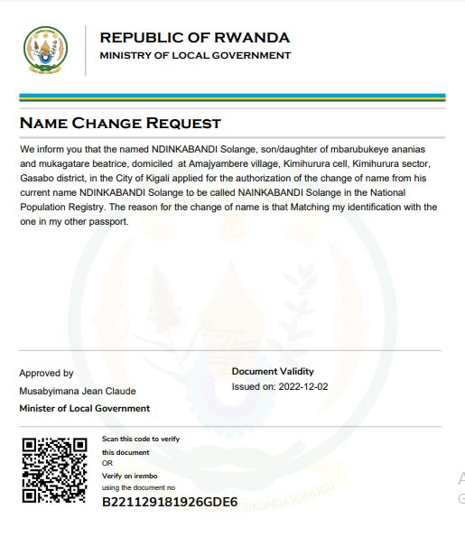 Uwitwa NDINKABANDI Solange yasabye guhindura amazina mu buryo bwemewe n’amategeko akitwa NAINKABANDI Solange mu bitabo by’irangamimerere.