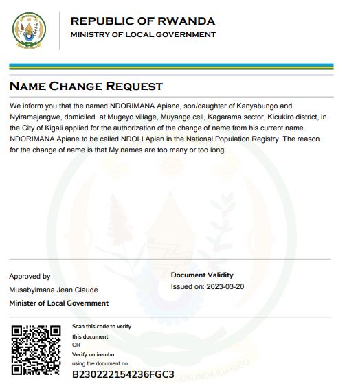 Uwitwa NDORIMANA Apiane yasabye guhindura amazina mu buryo bwemewe n’amategeko akitwa NDOLI Apian mu bitabo by’irangamimerere.
