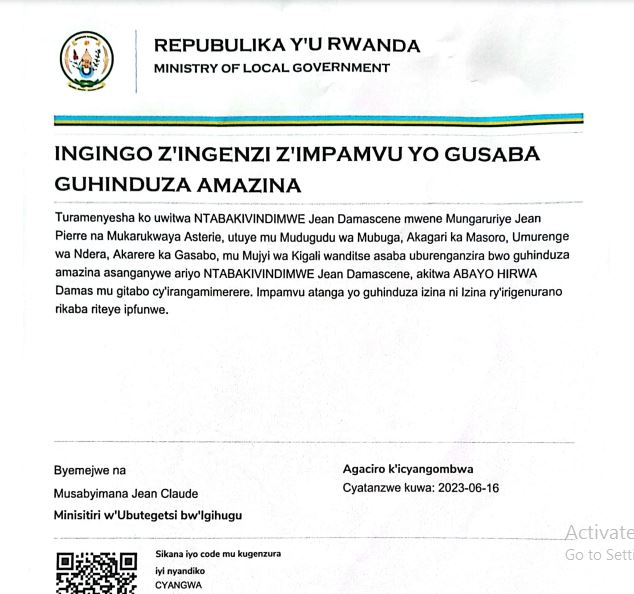 Uwitwa :NTABAKIVINDIMWE Jean Damascene yasabye guhindura amazina mu buryo bwemewe n’amategeko akitwa ABAYO HIRWA Damas mu bitabo by’irangamimerere.