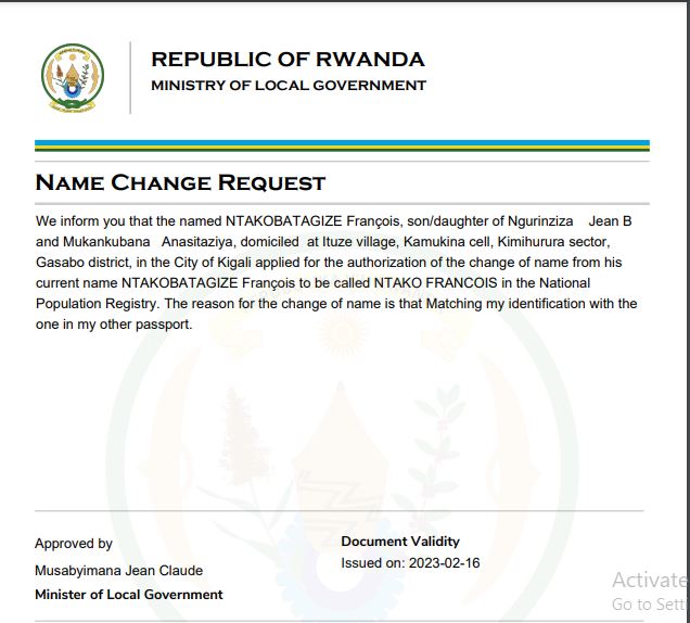 Itangazo:NTAKOBATAGIZE François yasabye guhindura amazina akitwa NTAKO FRANCOIS