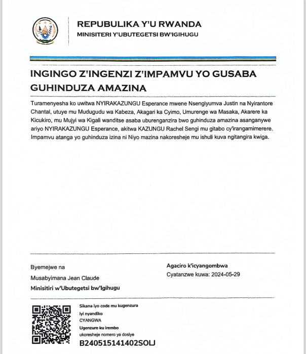 Uwitwa NYIRAKAZUNGU Esperence yasabye guhindura amazina mu buryo bwemewe n’amategeko akitwa KAZUNGU Rachel Sengi mu bitabyo by’irangamimerere!