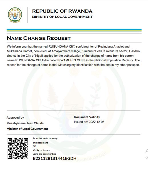 Uwitwa RUGUNDANA Cliff yasabye guhindura amazina mu buryo bwemewe n’amategeko akitwa RWAMUHIZI CLIFF mu bitabo by’irangamimerere.