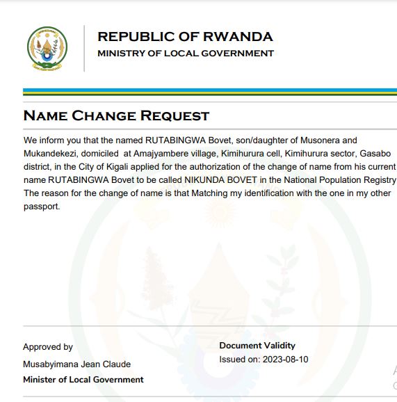 Uwitwa RUTABINGWA Bovet yasabye guhindura amazina mu buryo bwemewe n’amategeko NIKUNDA BOVET mu bitabo by’irangamimerere.