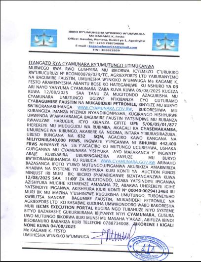 Umuhesha w’inkiko w’umwuga aramenyesha abantu bose ko hateganijwe ku ncuro ya gatatu ari nayo yanyuma cyamunara y’umutungo utimukanwa uherereye mu karere ka Ngoma