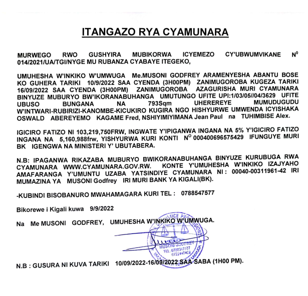 UMUHESHA W’INKIKO W’UMWUGA, ARAMENYESHA ABANTU BOSE KO AZATEZA MURI CYAMUNARA UMUTUNGO UFITE UPI:1/03/05/04/3629 UHEREREYE MU MUDUGUDU W’INTWARI,AKAGALI KA RUBIRIZI, UMURENGE WA KANOMBE,AKARERE KA KICUKIRO.