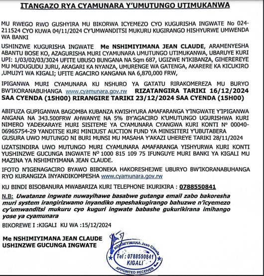 UMUHESHA W’INKIKO W’UMWUGA Me NSHIMIYIMANA JEAN CLAUDE ARAMENYESHA ABANTU BOSE KO AZAGURISHA MURI CYAMUNARA UMUTUNGO UTIMUKANWA UGIZWE N’IKIBANZA GIHEREREYE MU KARERE KA KICUKIRO.