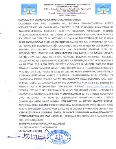 Me Kagame k. Festo umuhesha w’inkiko w’umwuga aramenyesha abantu bose ko azagurisha muri cyamunara binyuze mu buryo bw’ikoranabuhanga umutungo ugizwe n’inzu yo guturamo iherereye mu karere ka Kicukiro.