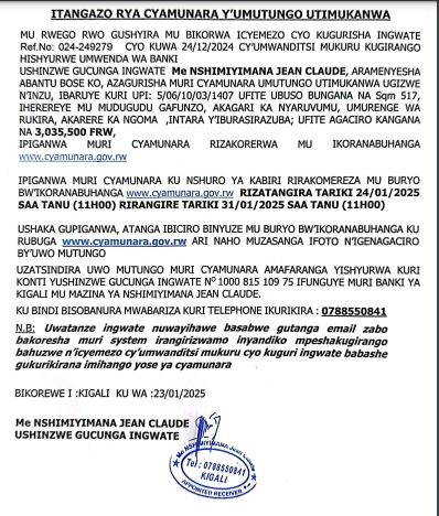 Me Nshimiyimana Jean Claude aramenyesha abantu bose ko azagurisha muri cyamunara umutungo utimukanwa ugizwe n’inzu iherereye mu karere ka Ngoma mu ntara y’Iburasirazuba