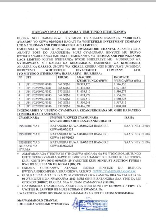 UMUHESHA W’INKIKO W’UMWUGA, ARAMENYESHA ABANTU BOSE KO AZATEZA MURI CYAMUNARA IMITUGO ITIMUKANWA YA Thomas AND PIRONGLANDS LACs LIMITEED IGIZWE N’IBIBANZA BYOSE BIHEREREYE GASABO-KIMIRONKO-KIBAGABAGA-NYIRABWANA.