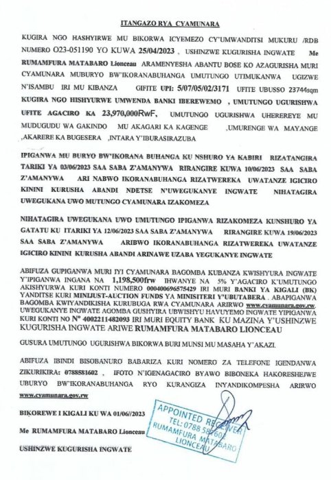 ITANGAZO RYA CYAMUNARA Y’UMUTUNGO UTIMUKANWA UGIZWE N’ISAMBU IHEREREYE BUGESERA