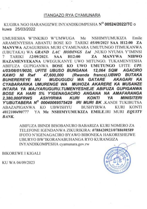 ITANGAZO RYA CYAMUNARA Y’UMUTUNGO UTIMUKANWA UGIZWE N’UBUTAKA BUHEREREYE MUSANZE