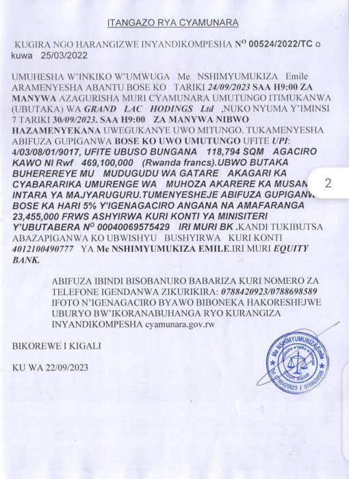 ITANGAZO RYA CYAMUNARA Y’UMUTUNGO UTIMUKANWA UGIZWE N’UBUTAKA BUHEREREYE MUSANZE