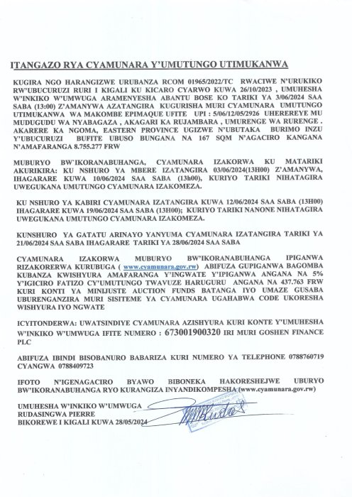 Itangazo rya cyamunara y’Umutungo utimukanwa.