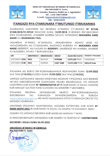 ITANGAZO RYA CYAMUNARA Y’UMUTUNGO UTIMUKANWA UHEREREYE BUGESERA