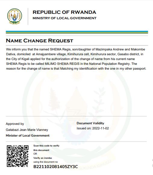 Uwitwa SHEMA Regis yasabye guhindura amazina mu buryo bwemewe n’amategeko akitwa MILIMO SHEMA REGIS mu bitabo by’irangamimerere.