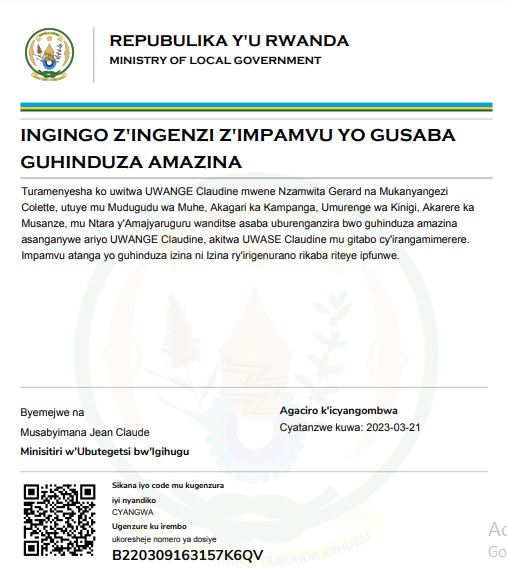 Uwitwa UWANGE Claudine yasabye guhindura amazina mu buryo bwemewe n’amategeko akitwa UWASE Claudine mu bitabo by’irangamimerere.